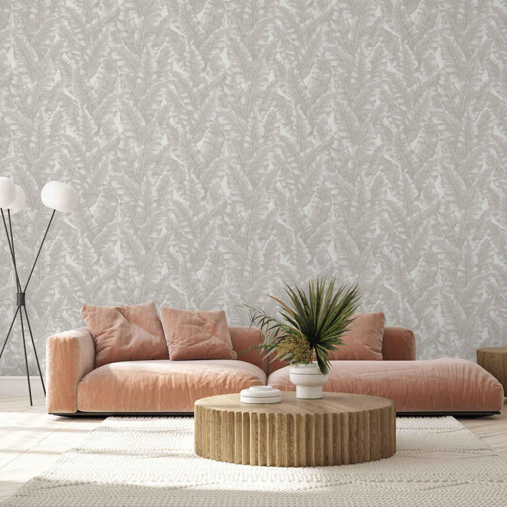 Luxusní vliesová tapeta s vinylovým povrchem, motivy banánových listů v odstínech pololesklé krémové.