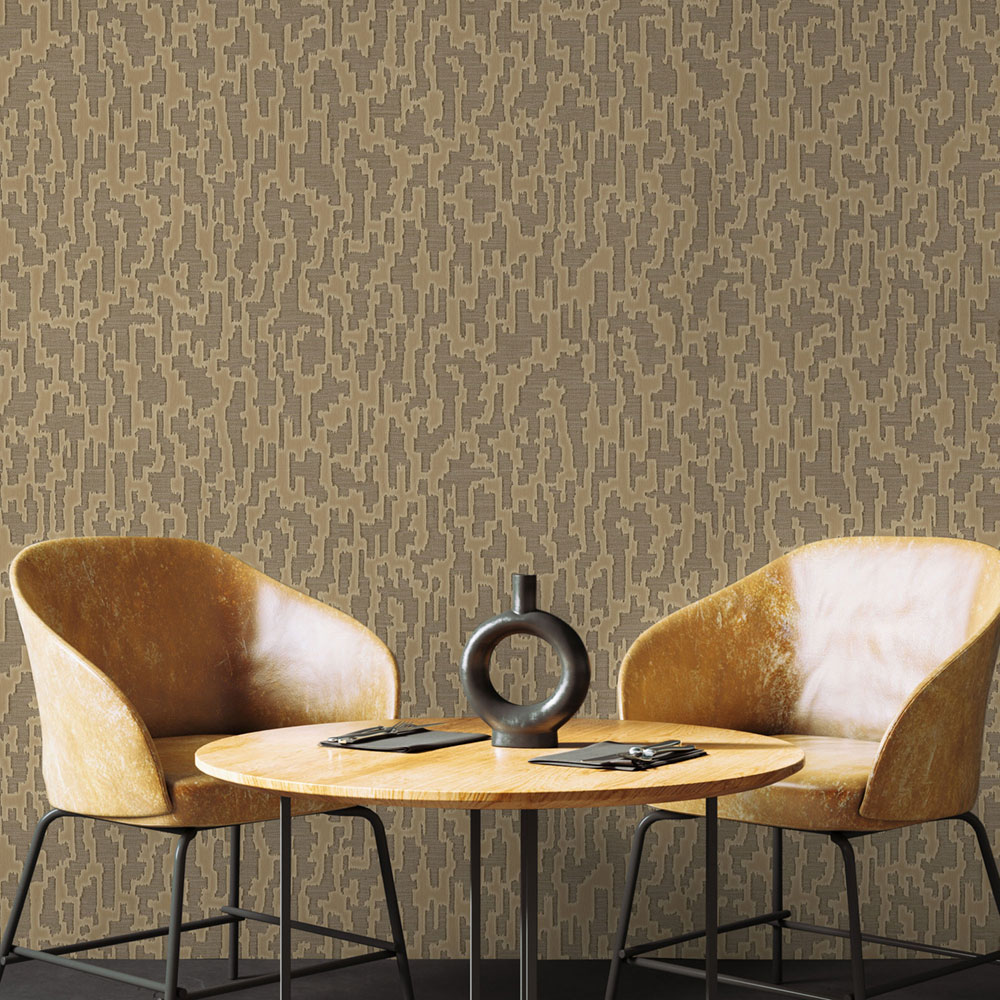 Vliesová tapeta s vinylovým povrchem, imitace látky v odstínech hnědé a zlaté.