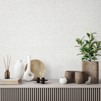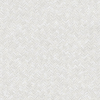 Vliesová tapeta s vinylovým povrchem, imitace lýkové rohože, odstíny bílo-šedé, perlové odlesky.