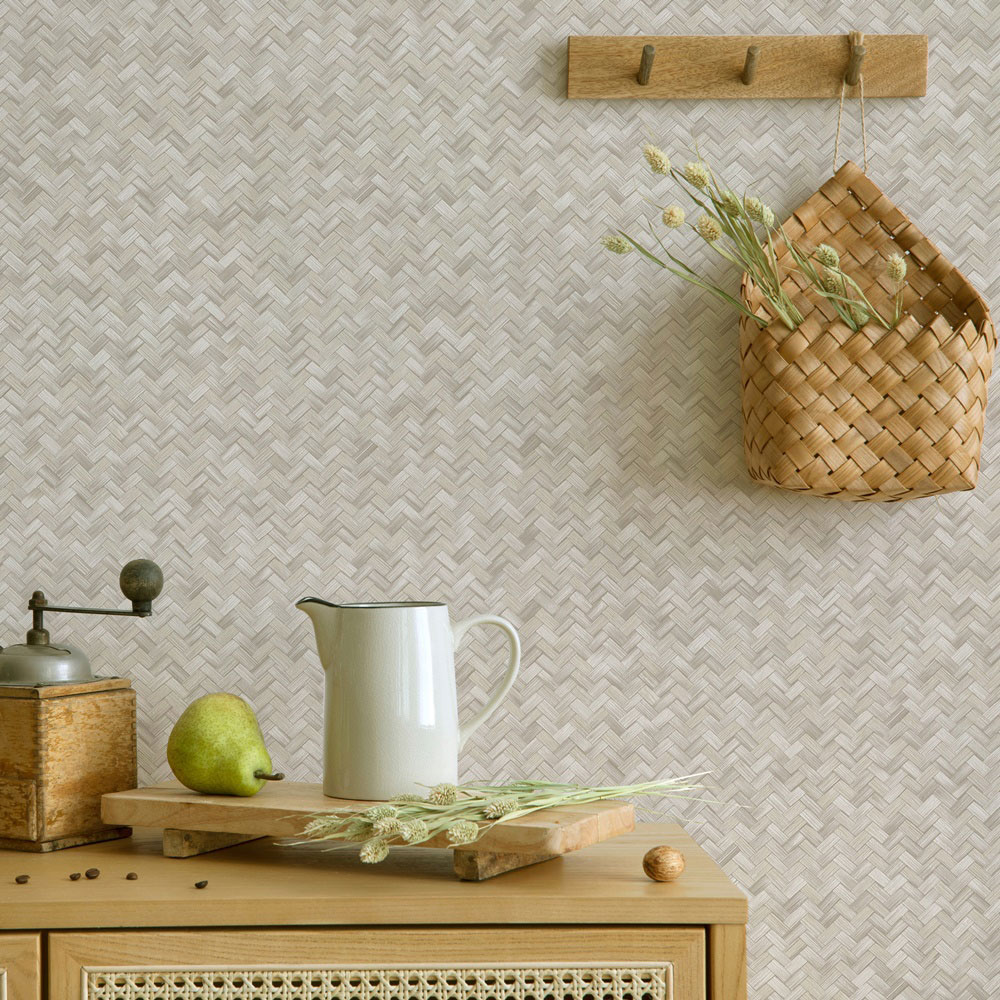 Vliesová tapeta s vinylovým povrchem, imitace lýkové rohože, odstíny pololesklé béžové.