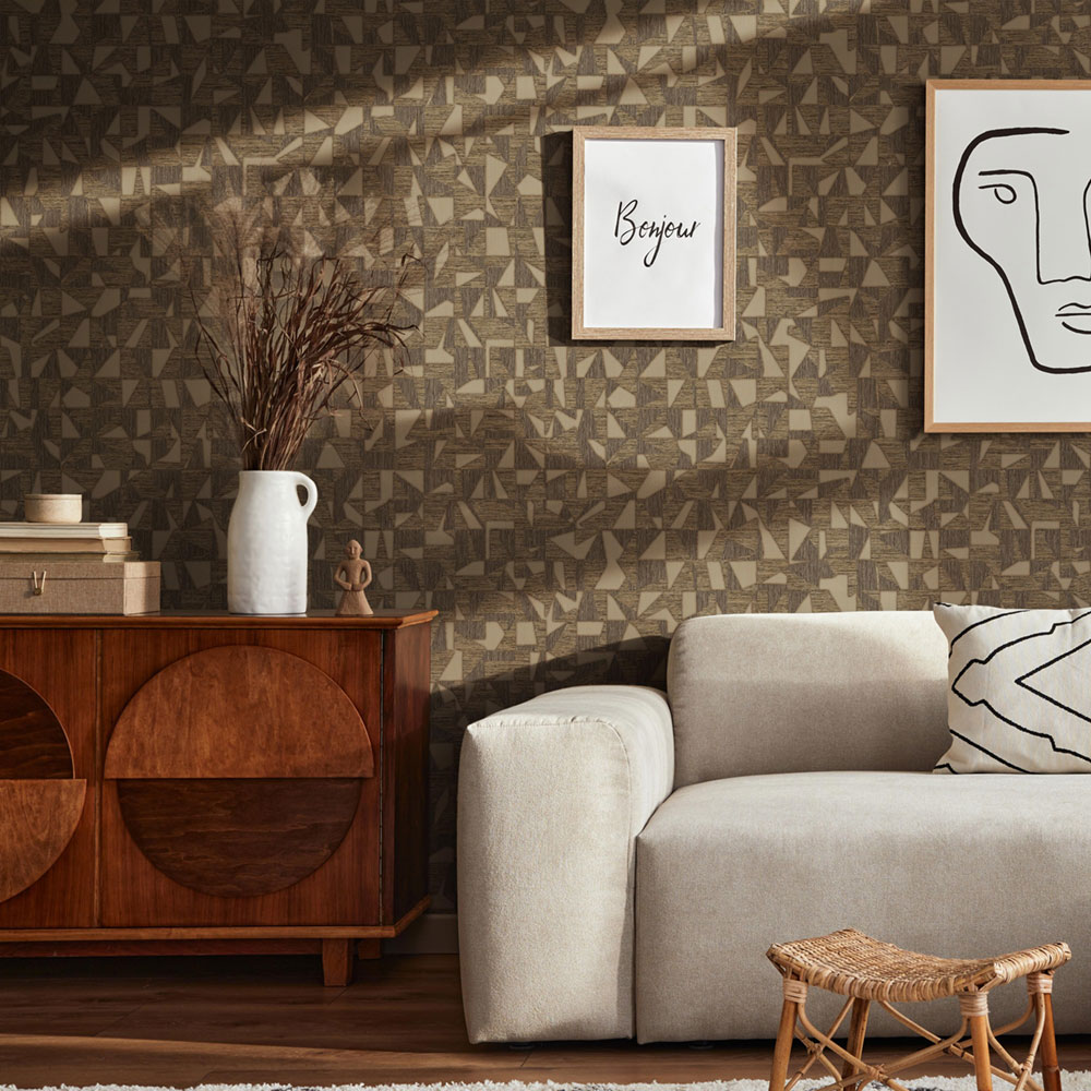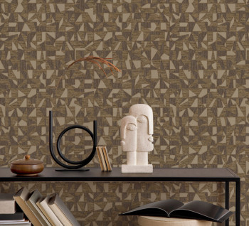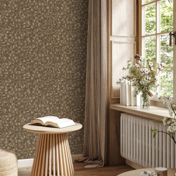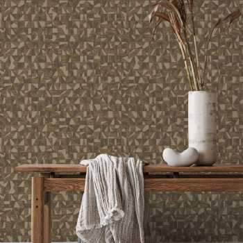 Geometrická vliesová tapeta s vinylovým povrchem, efektní střídání textur, odstíny hnědé a zlaté.