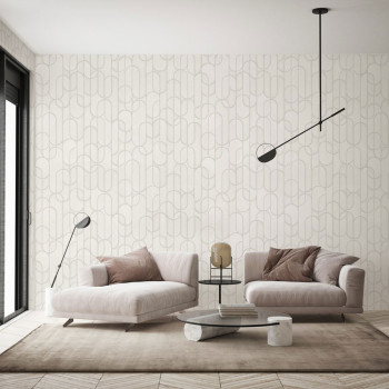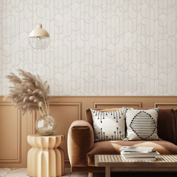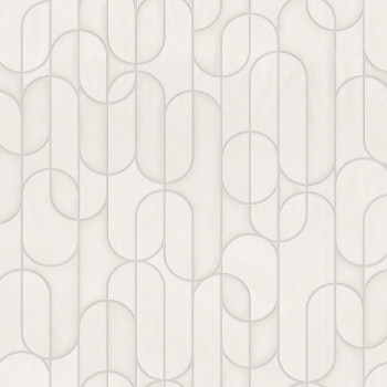 Geometrická vliesová tapeta s vinylovým povrchem, efektní střídání textur, odstíny krémové a šedo-krémové, hladké stříbrné obrysy.