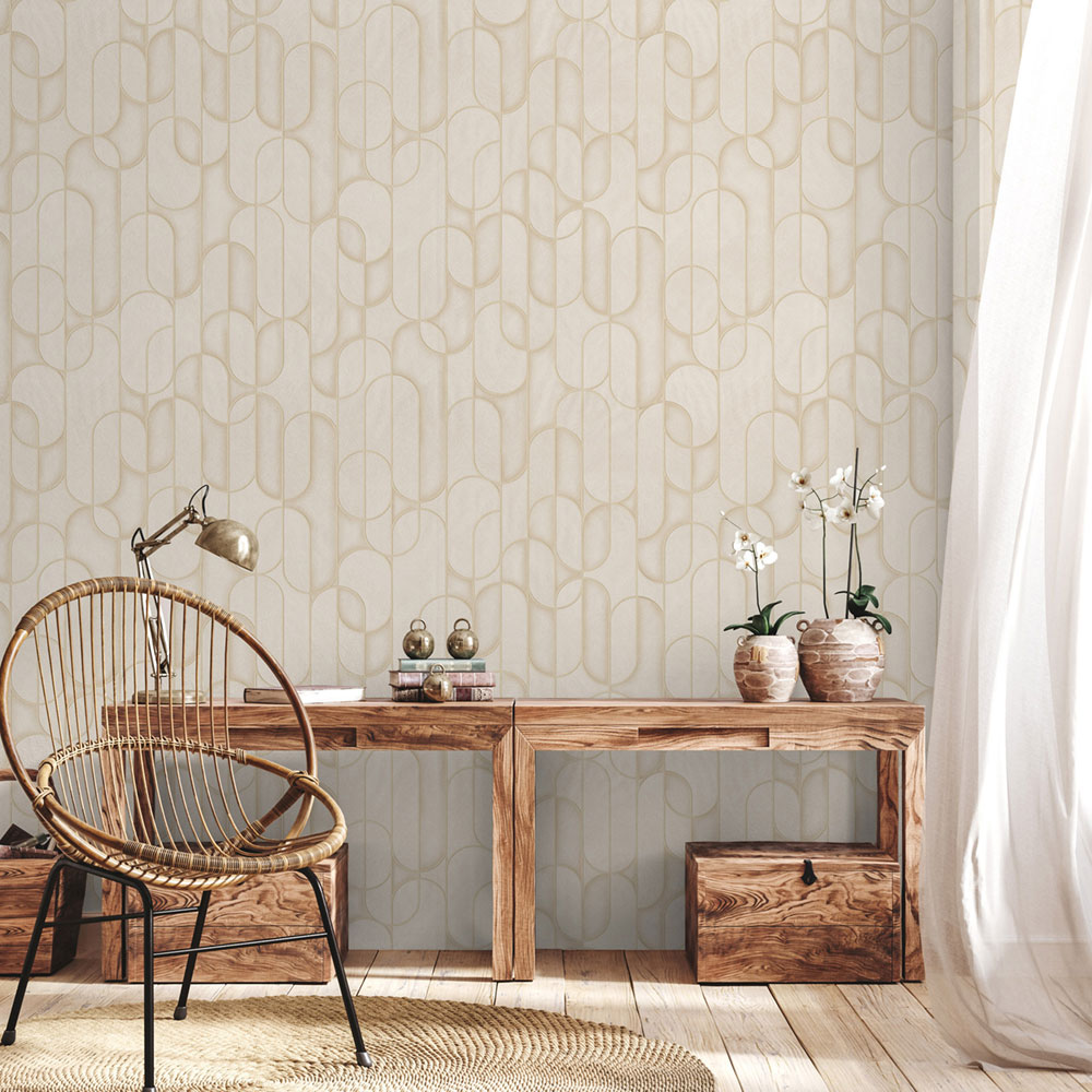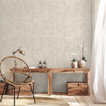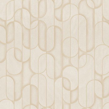 Geometrická vliesová tapeta s vinylovým povrchem, efektní střídání textur, odstíny béžové, hladké zlaté obrysy.