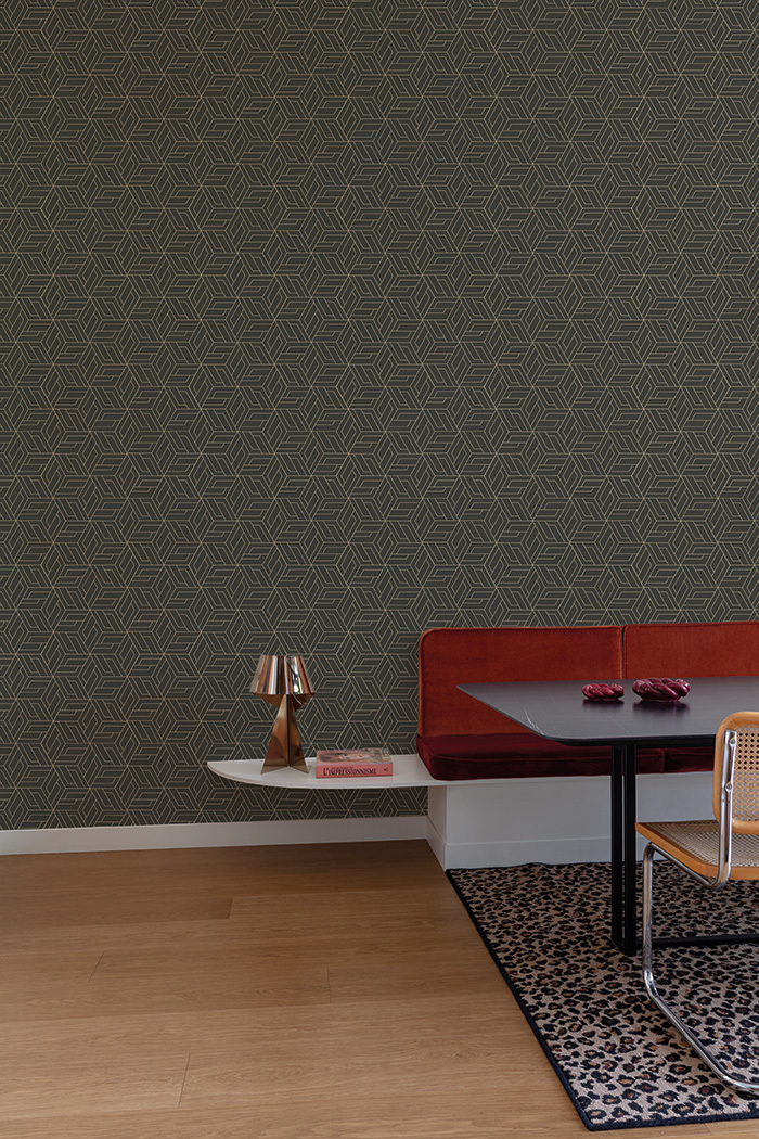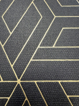 Černá plastická geometrická vliesová tapeta na zeď, zlaté obrysy.