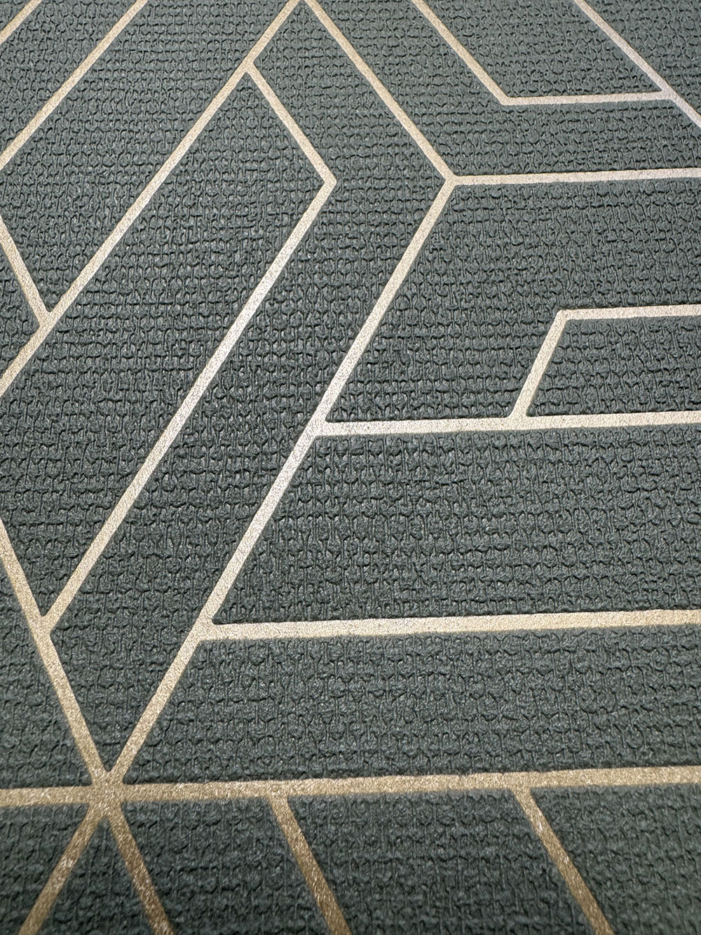 Zelená plastická geometrická vliesová tapeta na zeď, zlaté obrysy.
