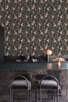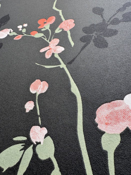 Černá vliesová tapeta na zeď, prolisovaný květinový vzor v odstínech zelené a růžové.