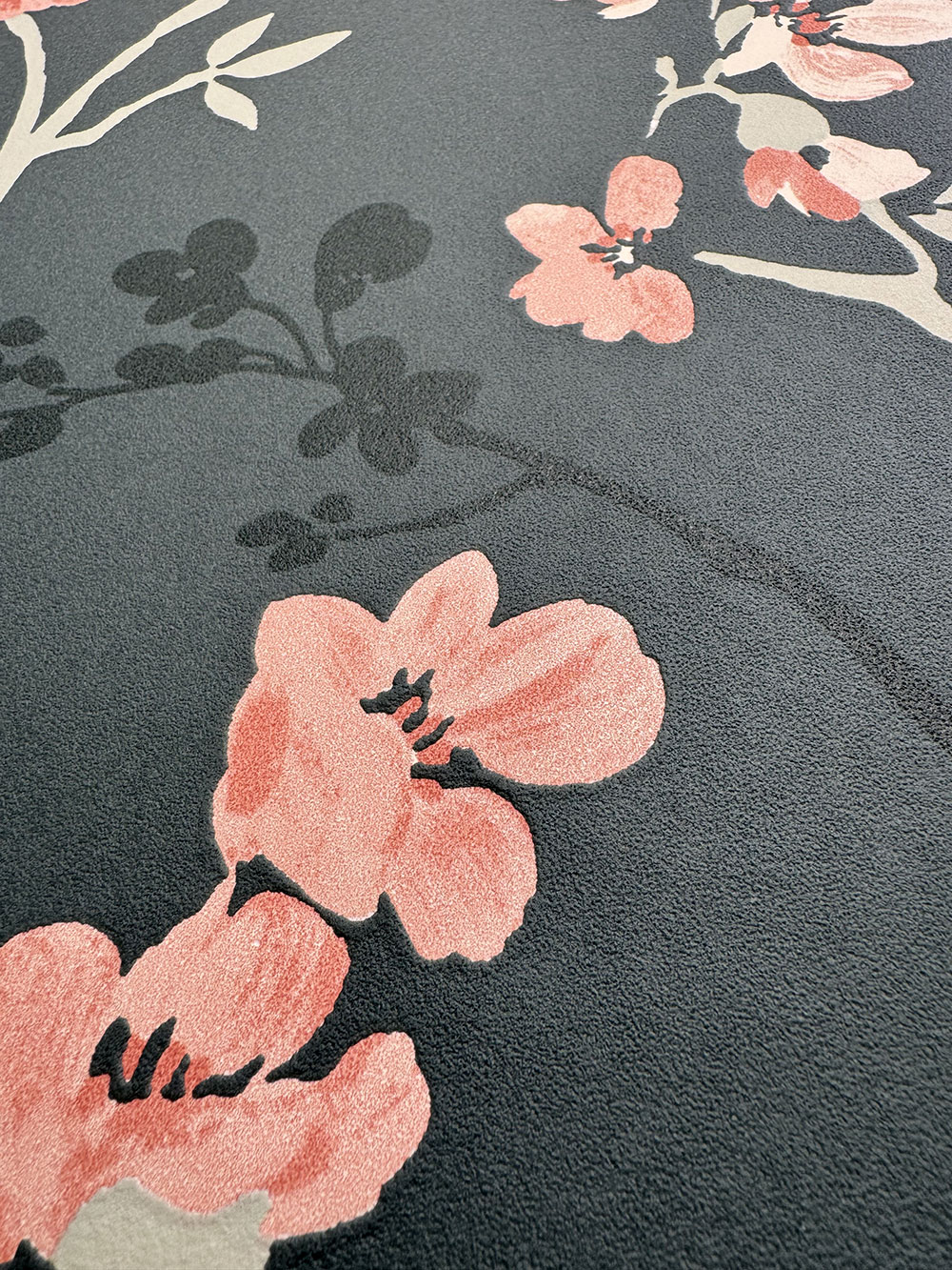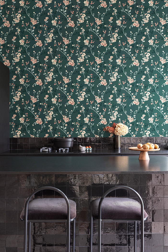 Zelená vliesová tapeta na zeď, prolisovaný květinový vzor v odstínech zelené a růžové.