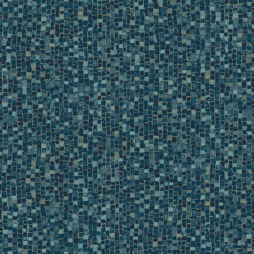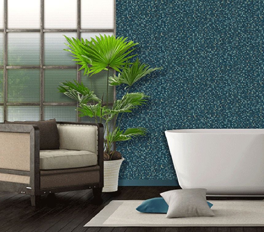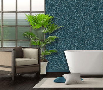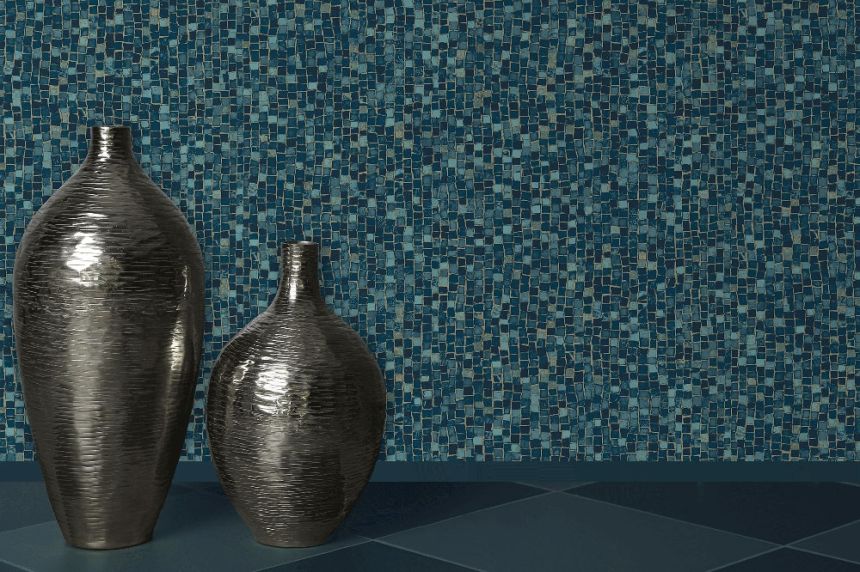 Design drobné mozaiky v modrých a modro-zelených odstínech, spáry matná bronzová. Tapeta je vysoce omyvatelná.