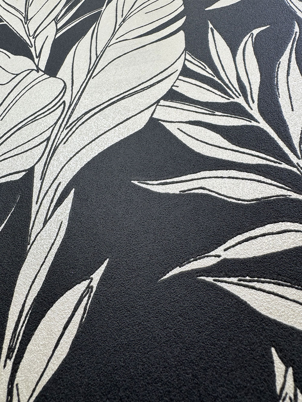 Matná černá vliesová tapeta na zeď, prolisované lesklé krémové listy.