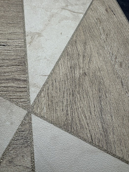 Geometrická vliesová tapeta na zeď, odstíny hnědé, béžové a šedočerné. Motiv dřeva a mramoru, béžové metalické obrysy.
