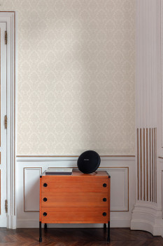 Vliesová tapeta se zámeckým damaškovýcm vzorem, látková textura. Pololesklý podklad, vzor v odstínu taupe / šedo-béžová.