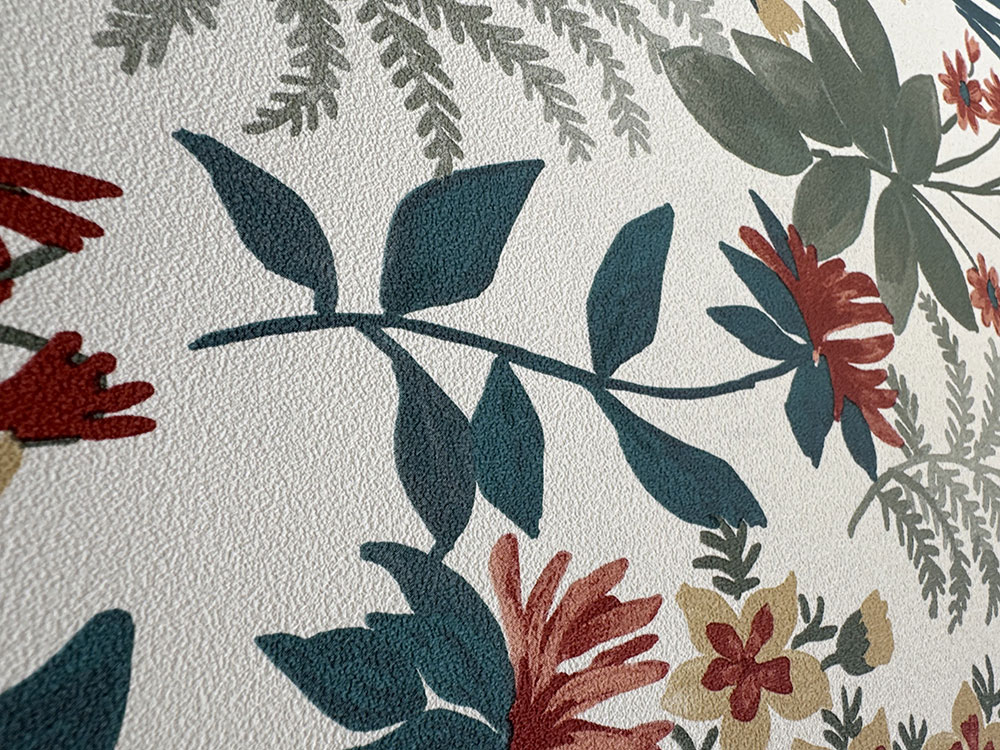 Vliesová tapeta na zeď, motivy květin v odstínech zelené, tyrkysové, cihlově červené a béžové. Jemná krupičková textura.