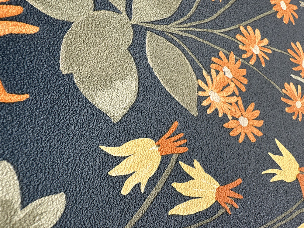 Tmavě modrá vliesová tapeta na zeď, motivy květin v zelených, cihlově oranžových a žlutých odstínech. Jemná krupičková textura.