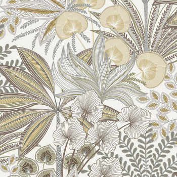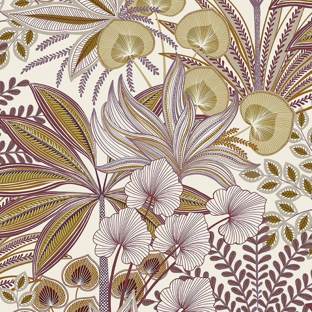 Bílá vliesová tapeta na zeď, motivy listů v odstínech fialové, okrové, terakotové, vínové a béžové, krupičková textura.