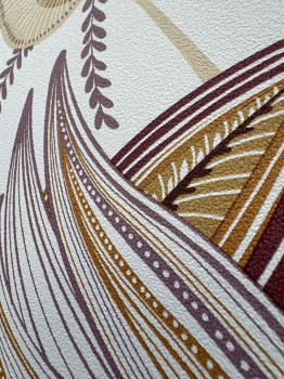 Bílá vliesová tapeta na zeď, motivy listů v odstínech fialové, okrové, terakotové, vínové a béžové, krupičková textura.