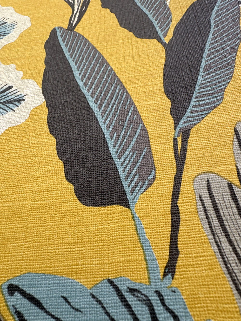 Okrová vliesová tapeta na zeď, motivy listů v odstínech tyrkysové, šedé, hnědé a béžové.