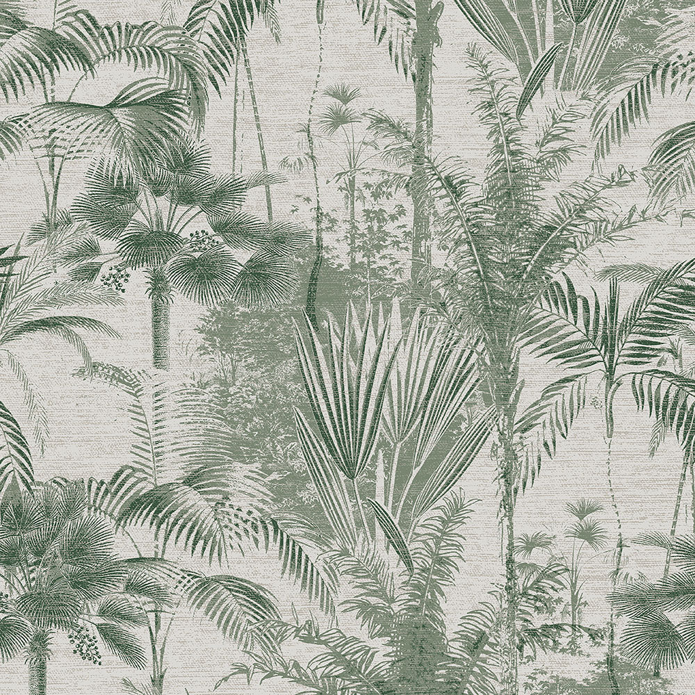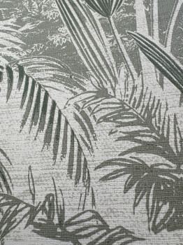 Vliesová tapeta na zeď, motivy listů a palem v odstínech zelené.