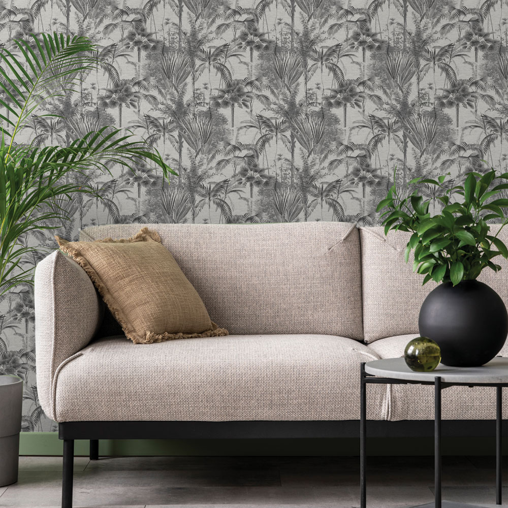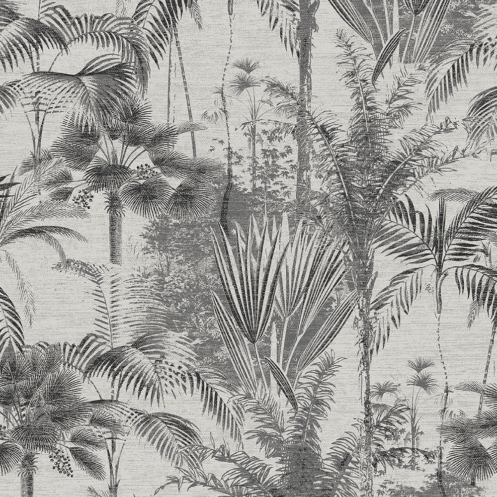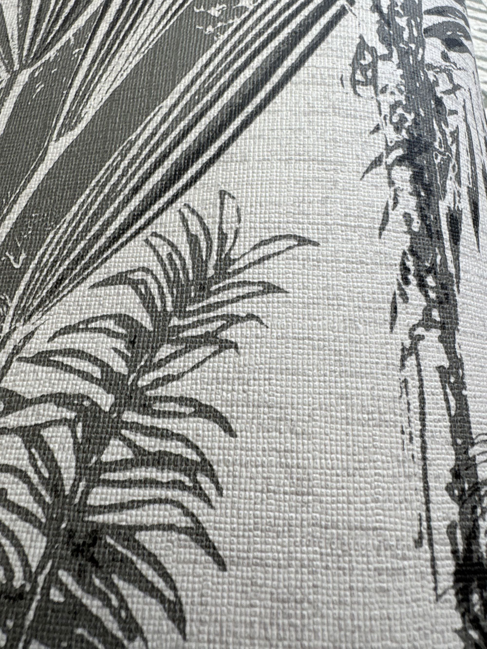 Vliesová tapeta na zeď, motivy listů a palem v odstínech šedé a černé.