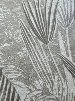 Vliesová tapeta na zeď, motivy listů a palem v šedo-béžových odstínech.