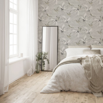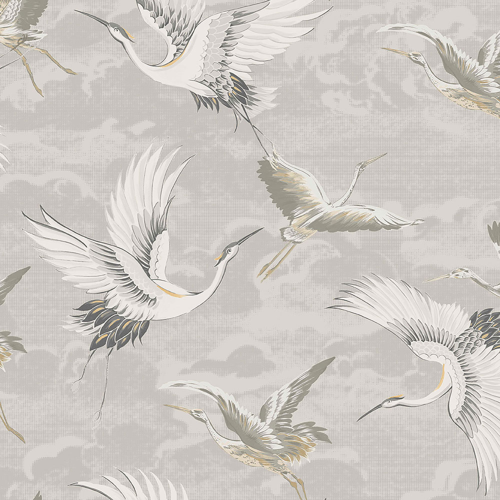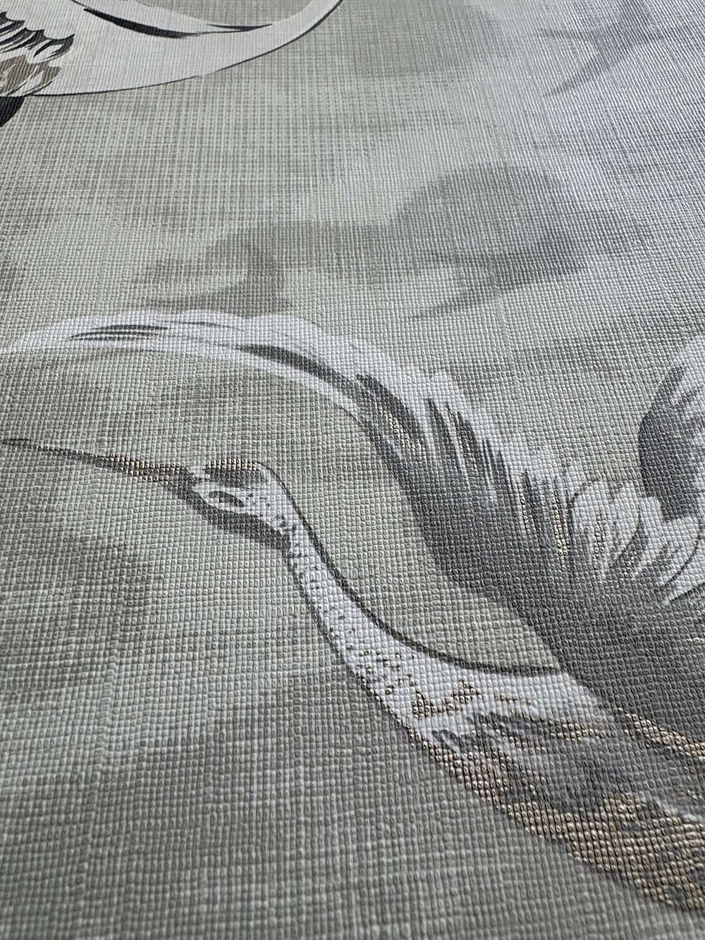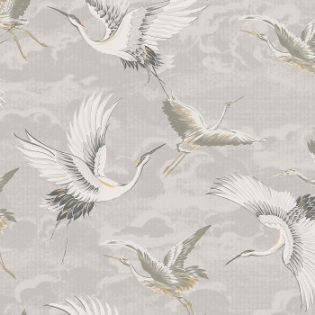 Šedá vliesové tapeta na zeď, motivy letících jeřábů v odstínu šedé, metalické detaily.