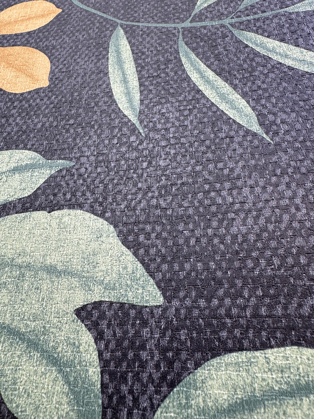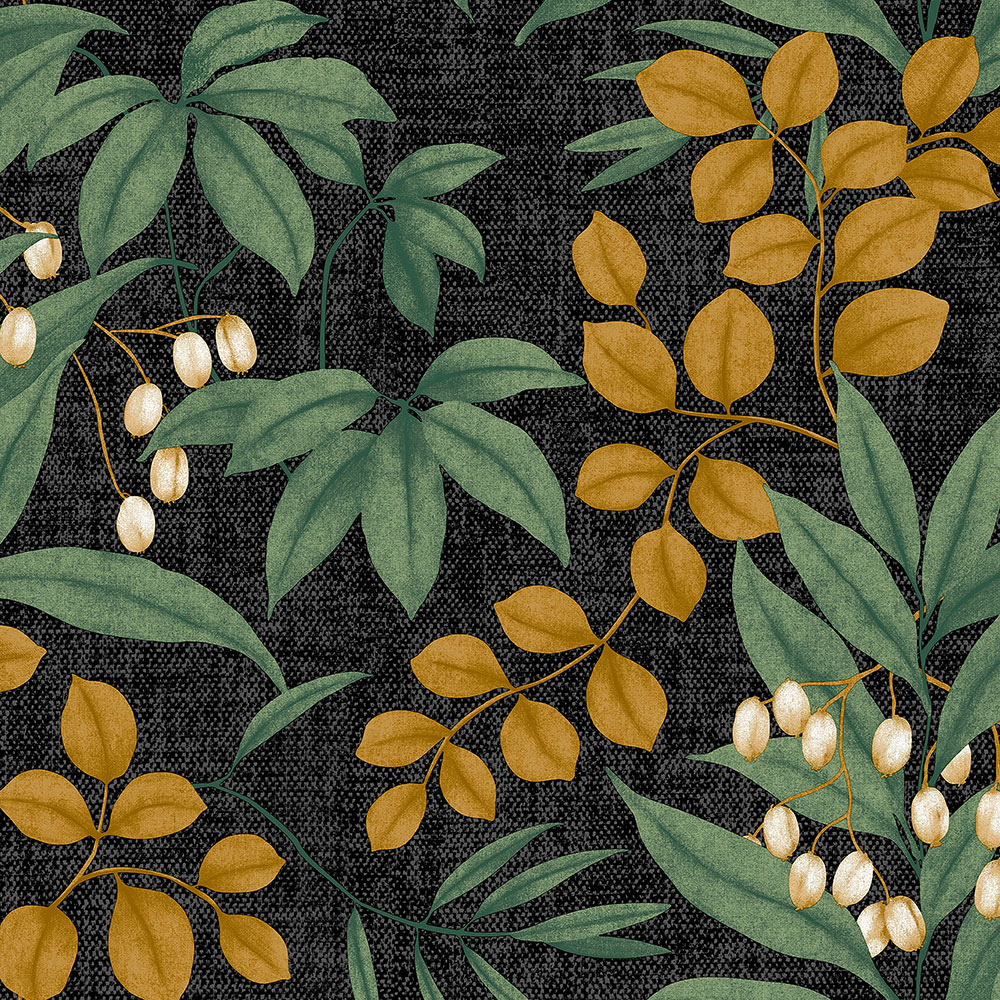Černá vliesové tapeta na zeď, větvičky a listy v odstínech zelené a okrové, vzhled hrubší textilie.