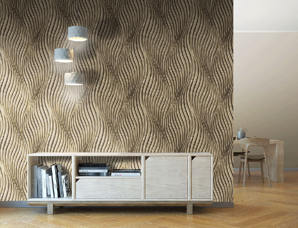 Hladká metalická tapeta, efektní design hnědo-zlatých vln dodá vašemu interiéru styl.