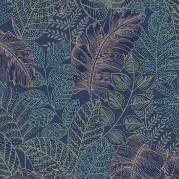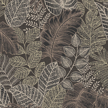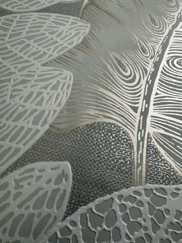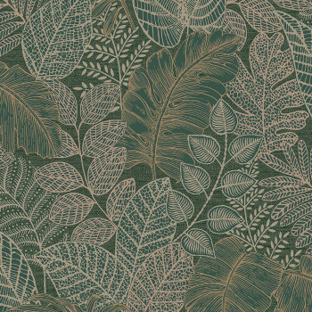 Plastická vliesová tapeta na zeď, zeleno-zlatý podklad, listy zelené, šedé a metalické - světlé zlato.