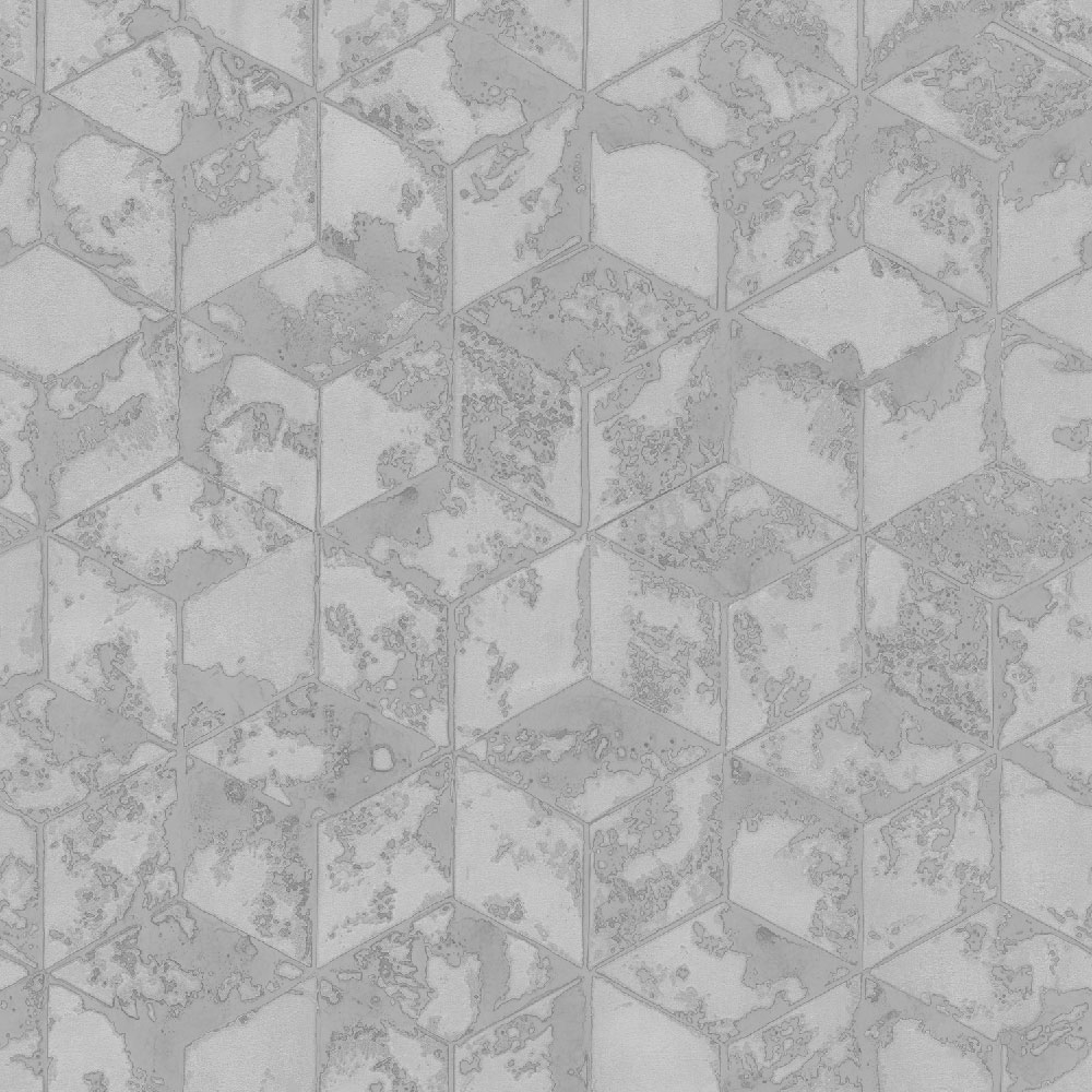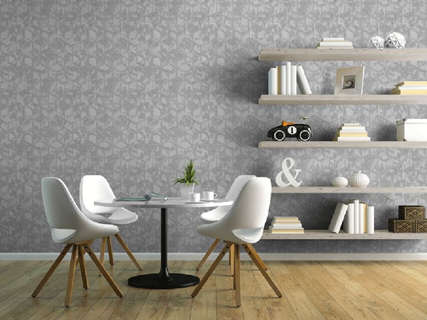Geometrické vzory vnášejí do interiéru nový rozměr. Výrazně plastický geometrický vzor, prolisy lesklé stříbrné, vystouplé části šedý mat.
