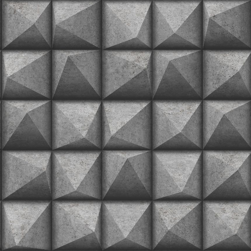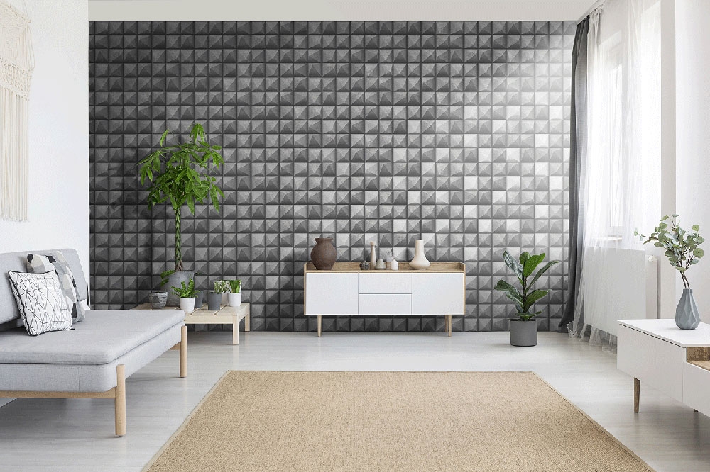 Design plastického čtvercového obkladu v matných černých, šedých a stříbrných odstínech. Hra barev a odstínů vytváří plastický efekt. Hladká, jemně krupičková textura.