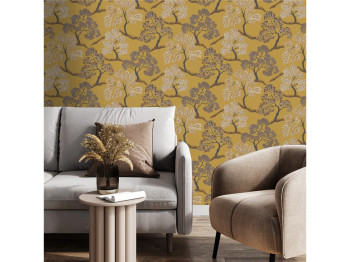Okrová vliesová tapeta na zeď, stromy se zlatými obrysy, látková textura.