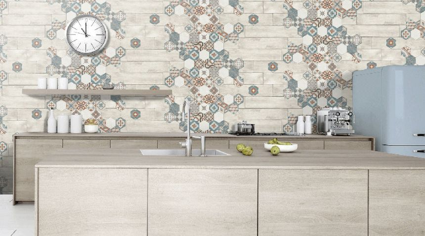 Efektní, netradiční spojení keramické mozaiky s přírodním dřevem. Dřevo v odstínech šedé, mozaika odstíny tyrkysové, šedé a pololesklé hnědo-bronzové.