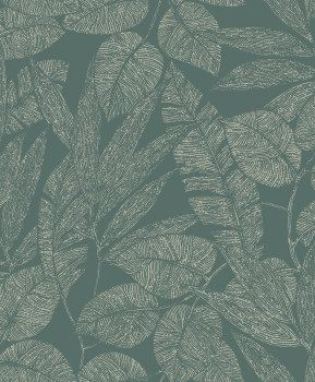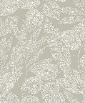Strukturovaná šedá vliesová tapeta na zeď, listy s bílými prolisy.