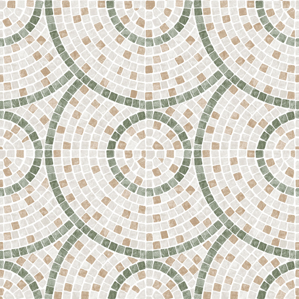 Vliesová tapeta s vinylovým povrchem, mozaikový vzor v odstínech šedé, hnědé a zelené, jemná textura.
