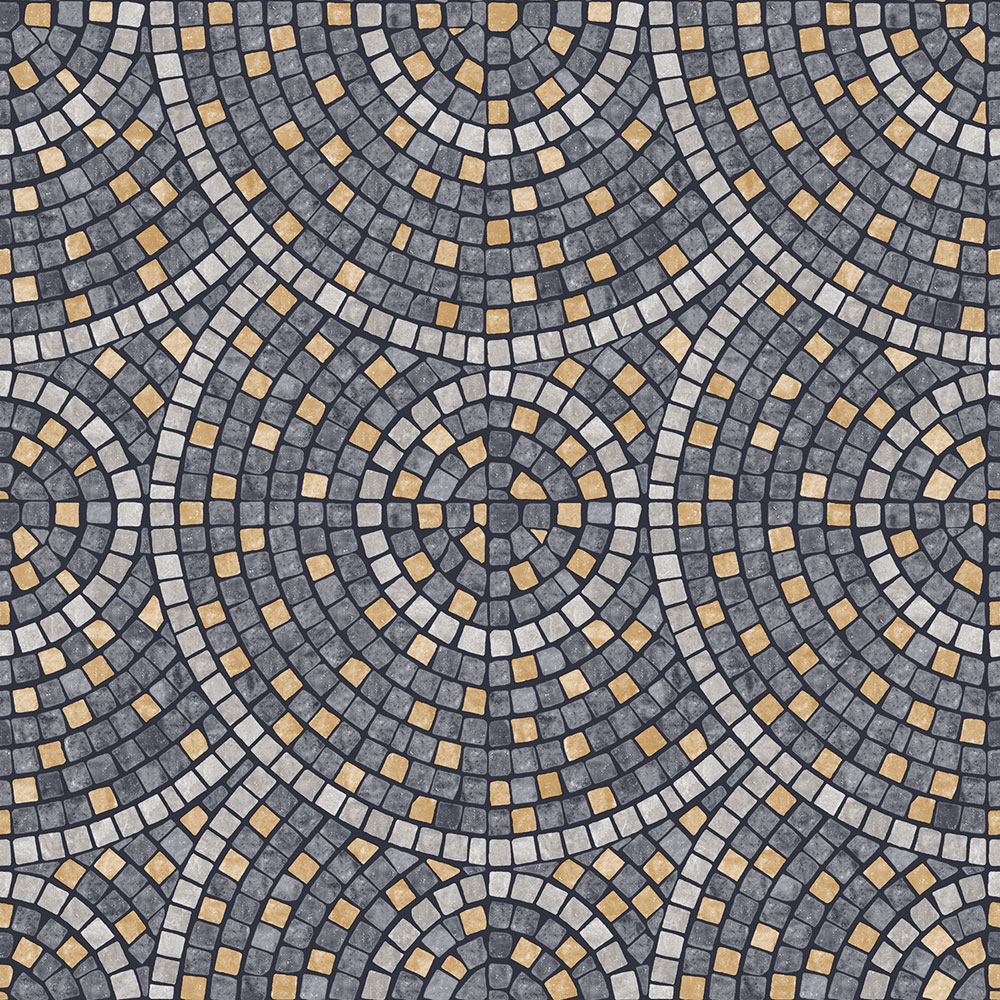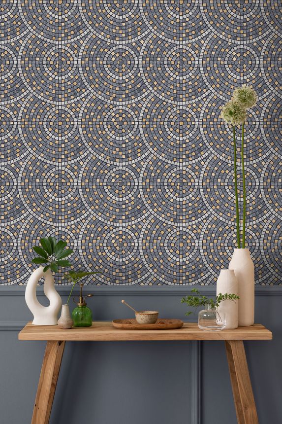 Vliesová tapeta s vinylovým povrchem, mozaikový vzor v odstínech šedé a okrově zlaté, jemná textura.