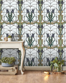 Šedo-bílá vliesová tapeta s vinylovým povrchem, design květinové vitráže v odstínech modré, zelené a béžové.
