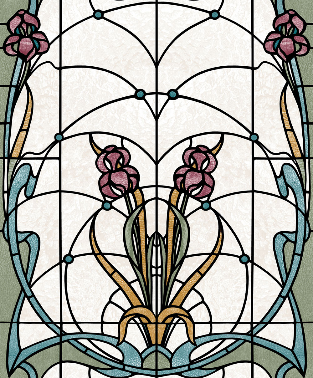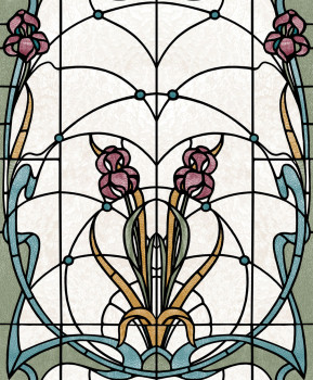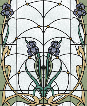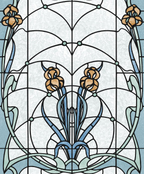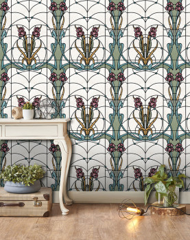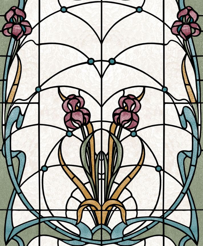 Pololesklá bílo-krémová vliesová tapeta s vinylovým povrchem, design květinové vitráže v odstínech modré, zelené, okrové a vínové.