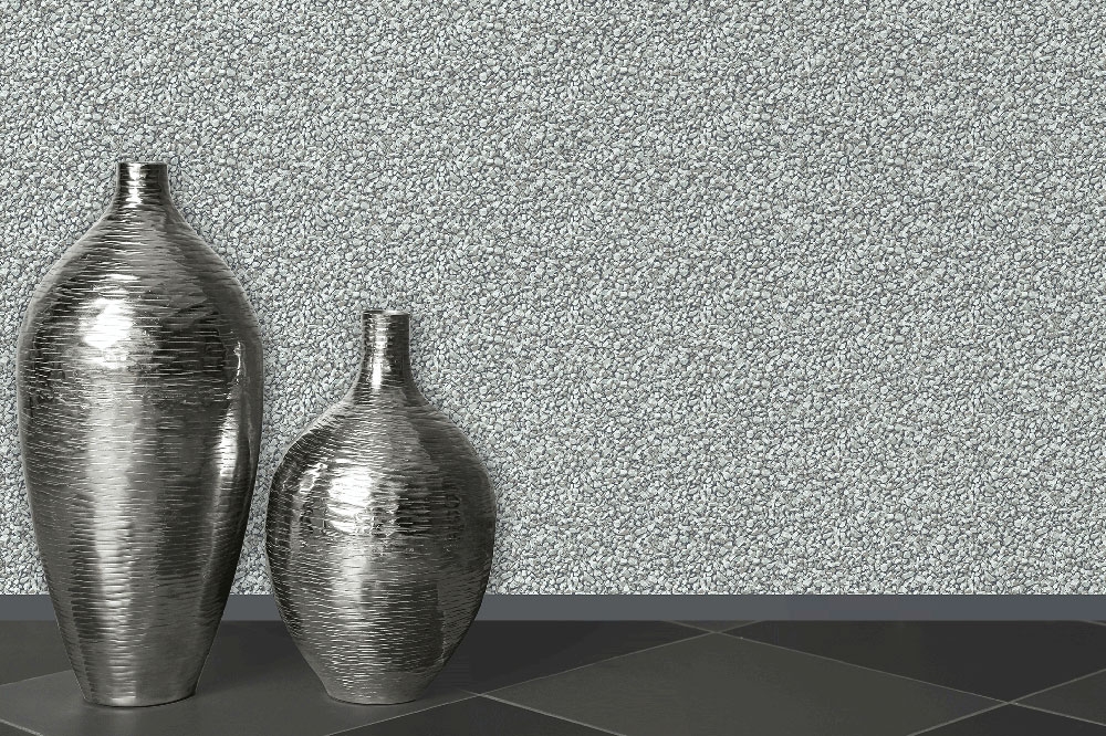 Design drobných kamínků s jemným pololeskem, v odstínech šedé a šedo-stříbrné.