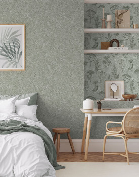 Vliesová tapeta na zeď, imitace korku se vzory lučních trav a květin, odstíny zelené.