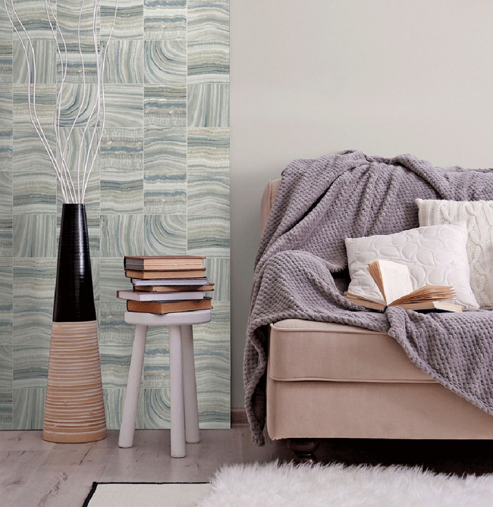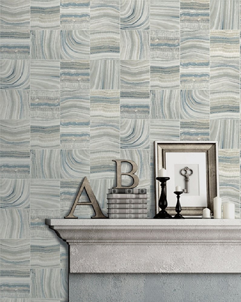 Design mramorovaných hladkých lesklých obkladů v modrých, béžových a šedých odstínech.