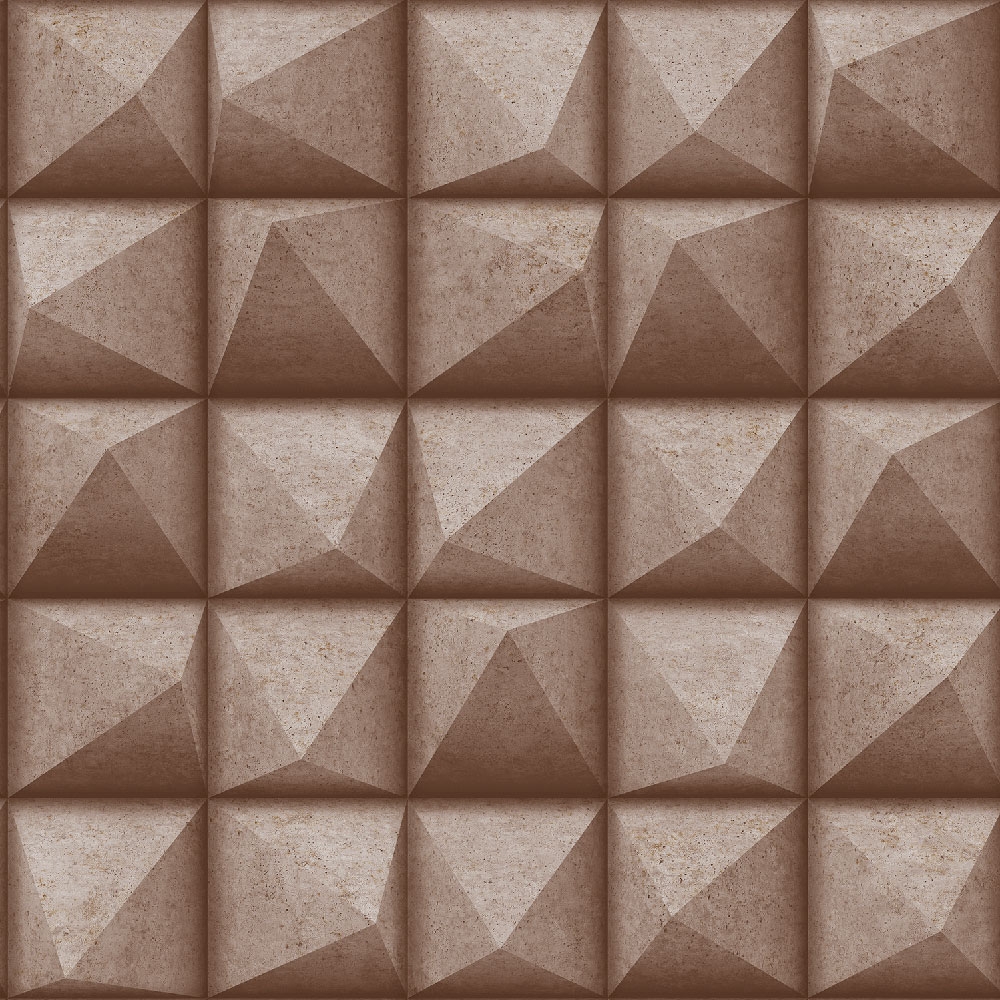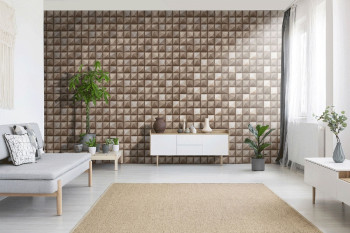 Design plastického čtvercového obkladu v matných hnědých, hnědo-zlatých a stříbrných odstínech. Hra barev a odstínů vytváří plastický efekt. Hladká, jemně krupičková textura.