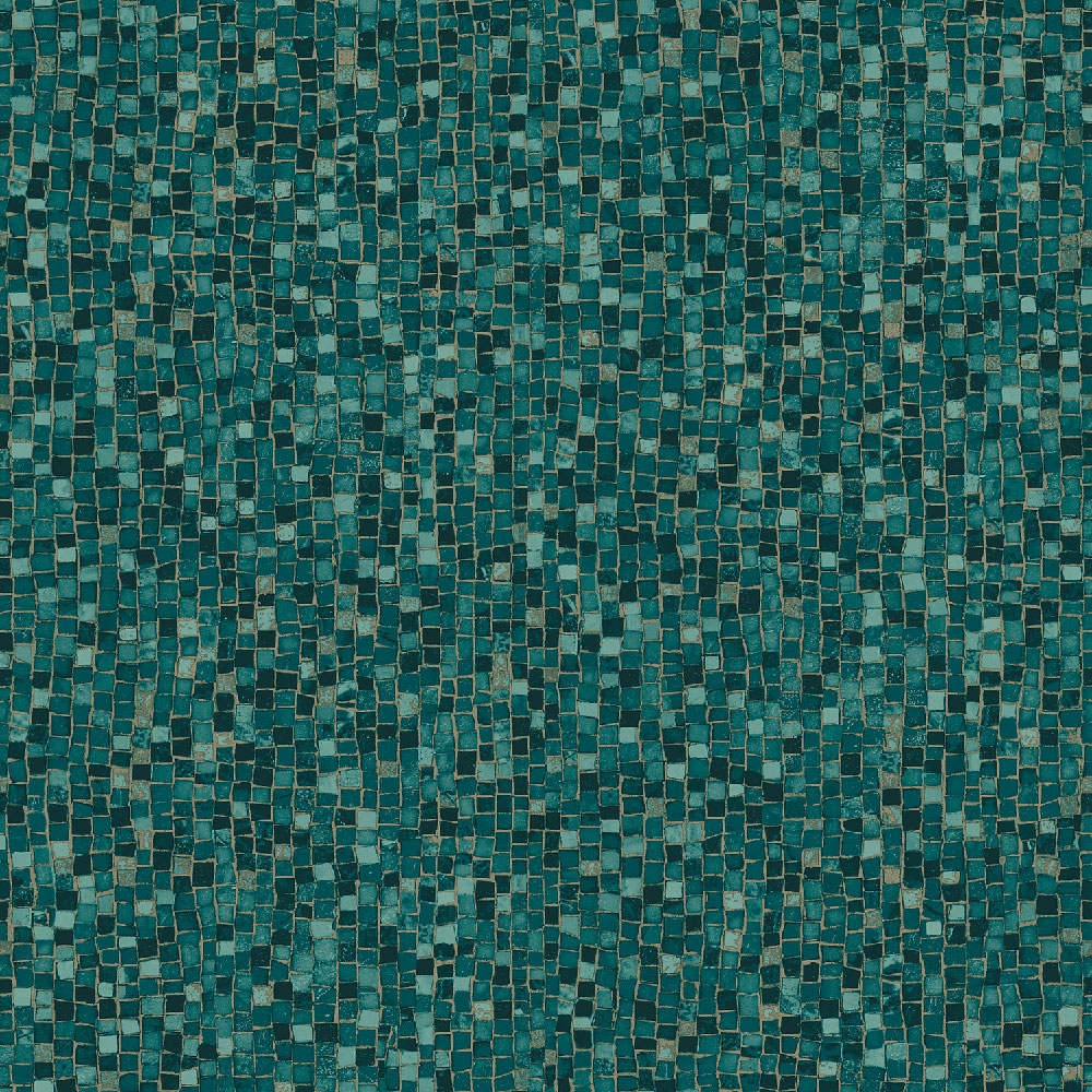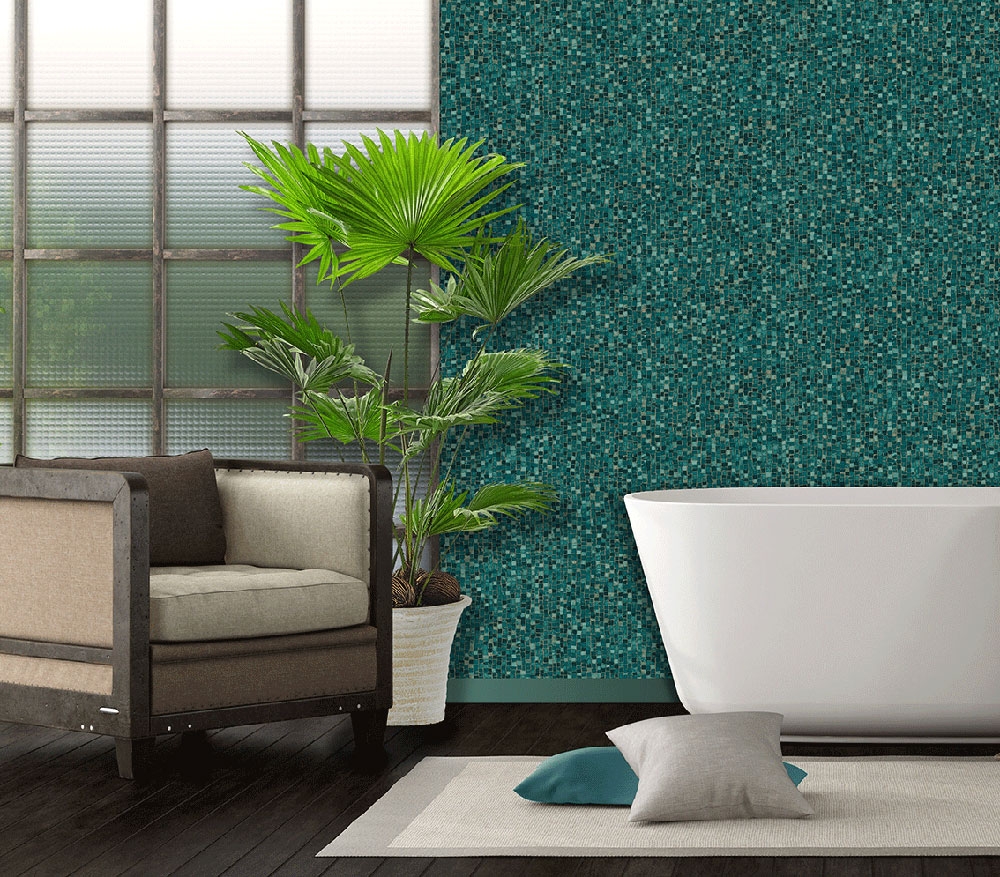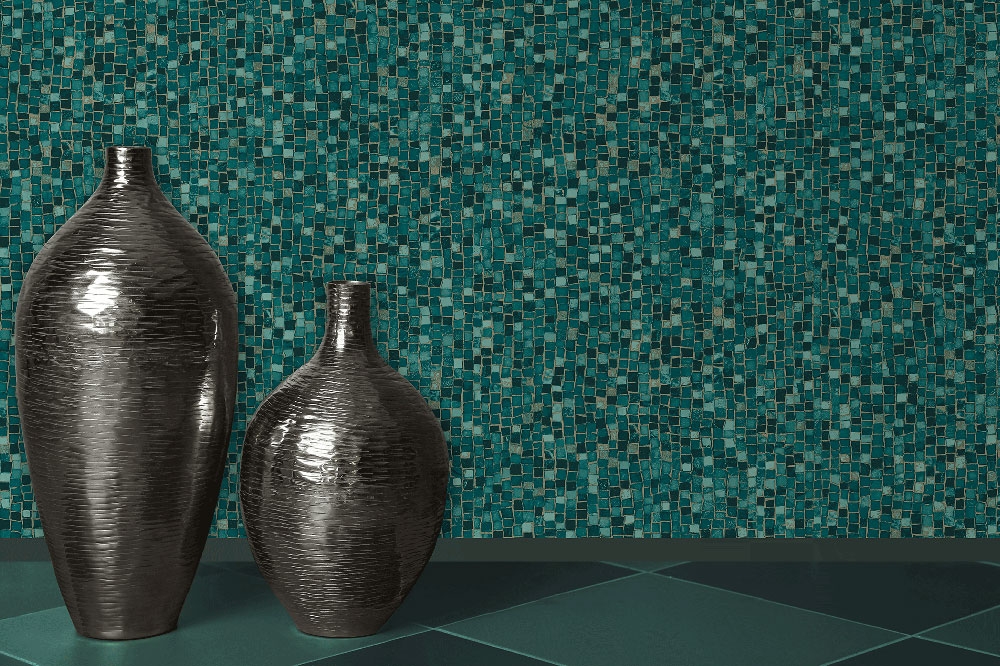 Design drobné mozaiky v zelených odstínech, spáry matná bronzová. Tapeta je vysoce omyvatelná.
