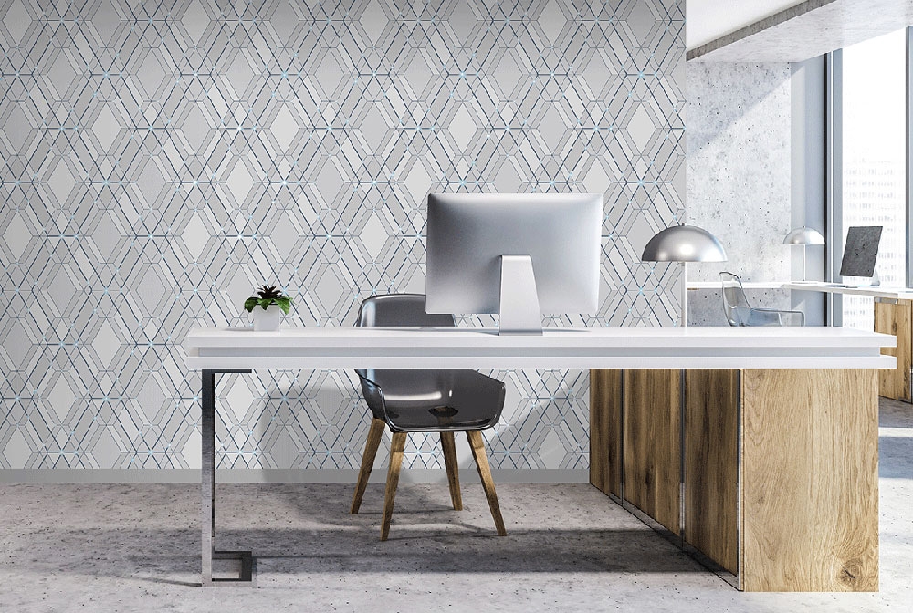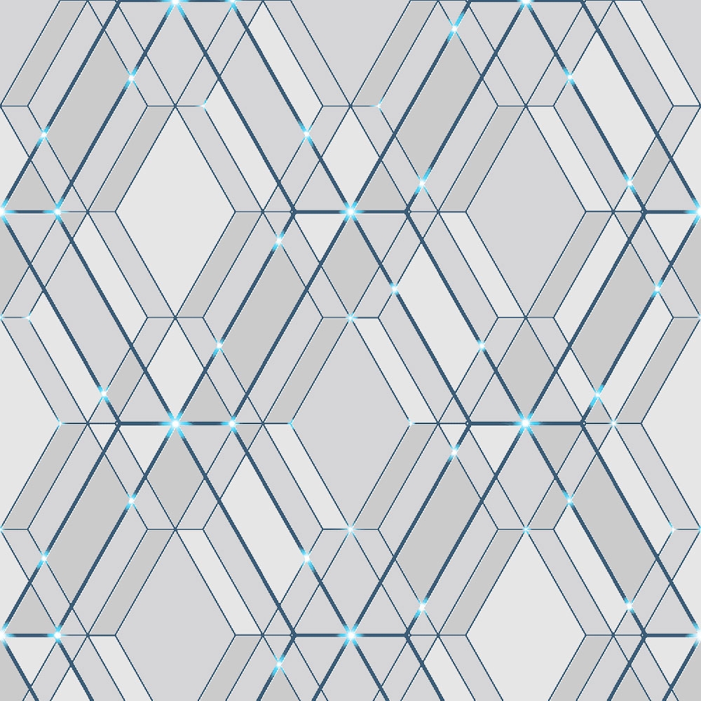 Metalické odlesky a výrazné textury dodají vašemu interiéru luxus a styl. Efektní geometrický vzor - střídavé světlé plastické plochy v odstínech bílé, šedo-modré, prolisované obrysy jsou hladké, v metalické modré.