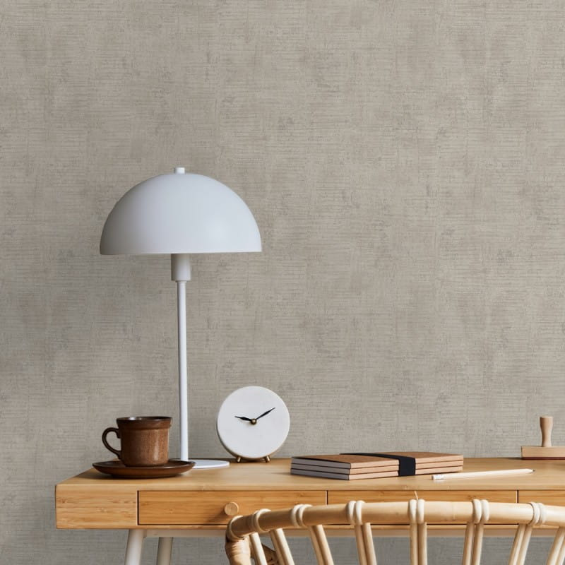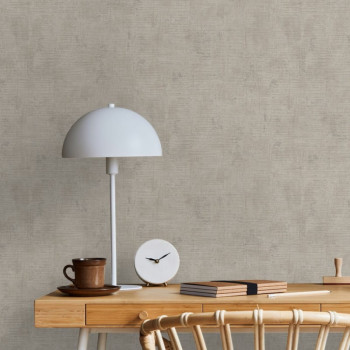 Vliesová tapeta s vinylovým povrchem, design evokující přírodní materiály v odstínech šedé s jemným, kovově stříbrným pololeskem.