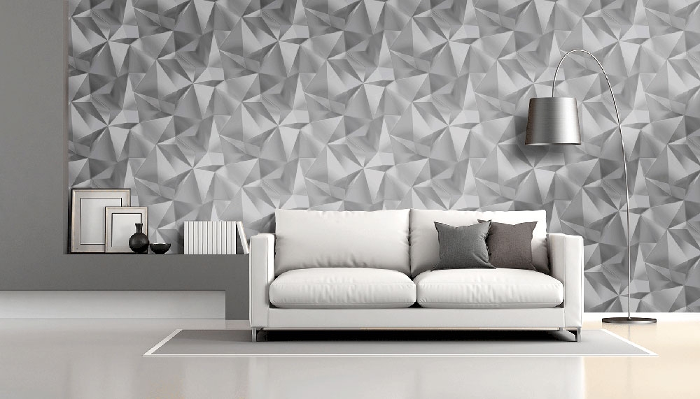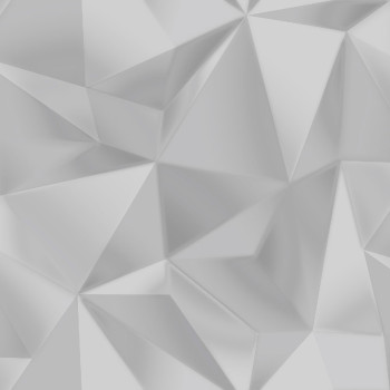 Hladká metalická tapeta, design černo-stříbrných geometrických vzorů. Hra barev a tónů vytváří prostorový efekt.