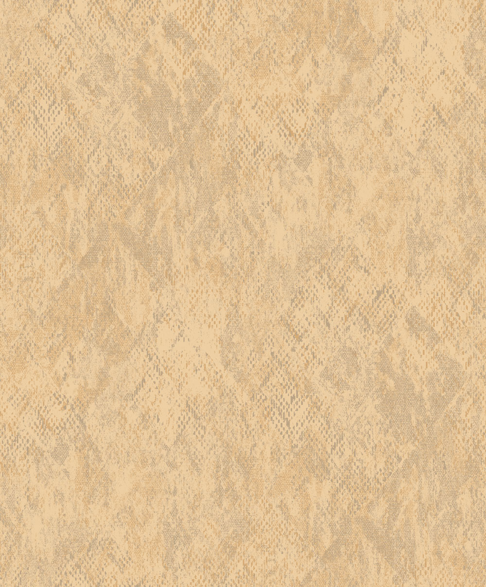Vliesová tapeta s vinylovým povrchem, design inspirovaný hadí kůží, odstíny béžové a okrové s metalickými zlatými akcenty.