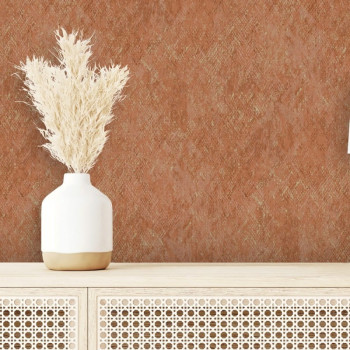 Vliesová tapeta s vinylovým povrchem, design inspirovaný hadí kůží, odstíny cihlové a růžové s metalickými zlatými akcenty.