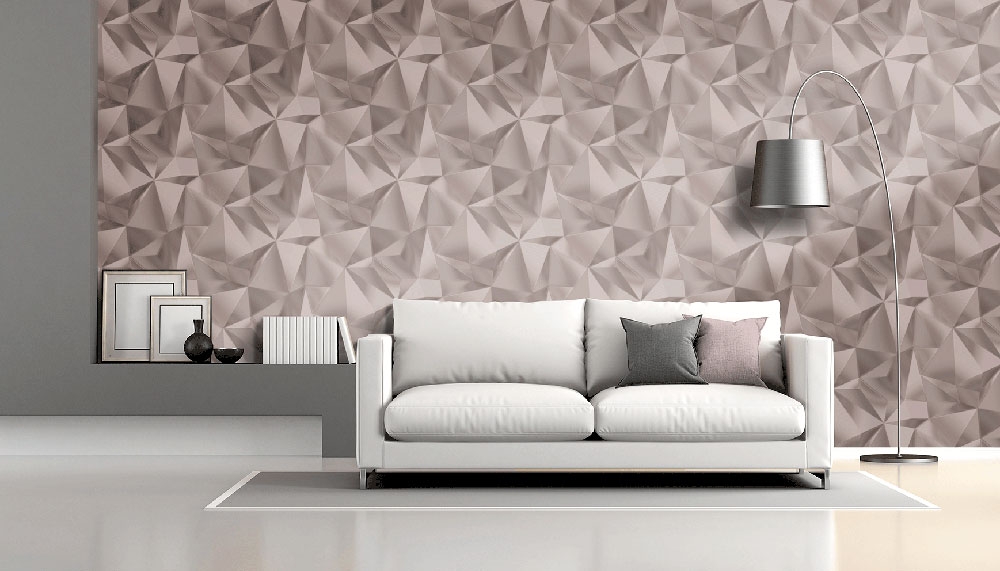 Hladká metalická tapeta, design geometrických vzorů v odstínech růžového zlata. Hra barev a tónů vytváří prostorový efekt.