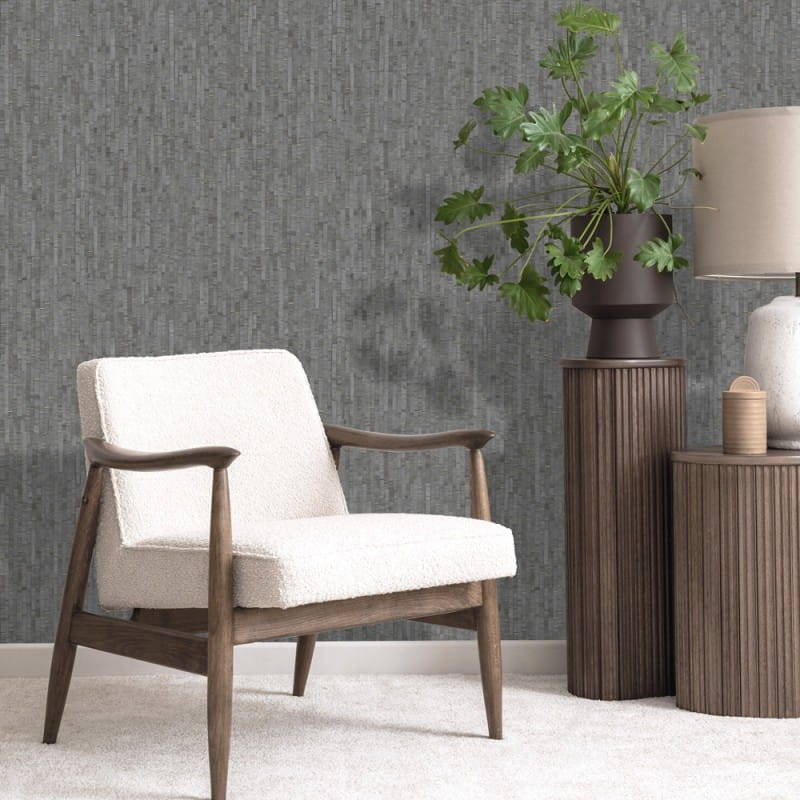 Vliesová tapeta s vinylovým povrchem, jemná textura, design přírodní rohože v odstínech tmavě šedé s drobnými stříbrnými detaily.