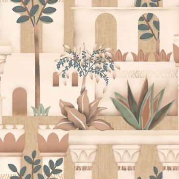Vliesová tapeta s vinylovým povrchem, jemná textura, sukulenty a středomořské stavby v odstínech hnědé, béžové, šedo-béžové a zelené.
