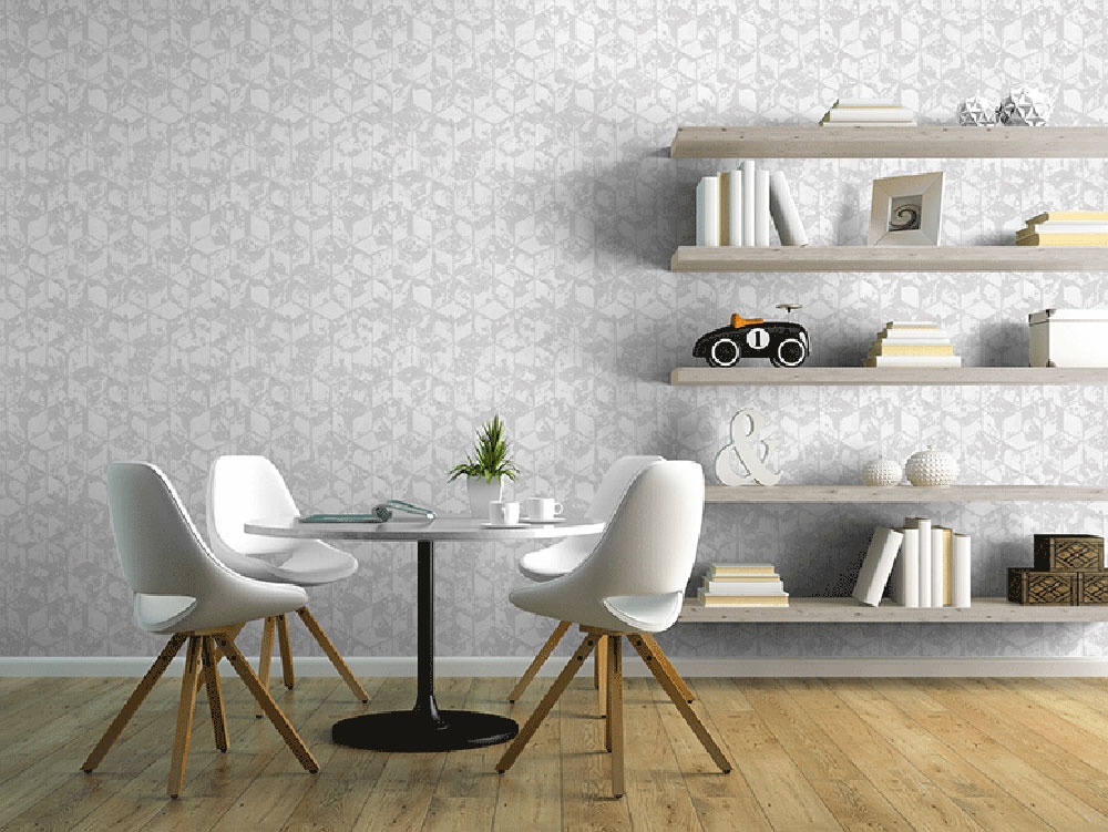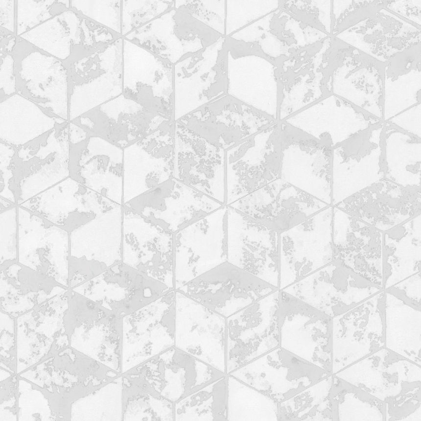 Geometrické vzory vnášejí do interiéru nový rozměr. Výrazně plastický geometrický vzor, prolisy lesklé stříbrné, vystouplé části světle šedý mat.